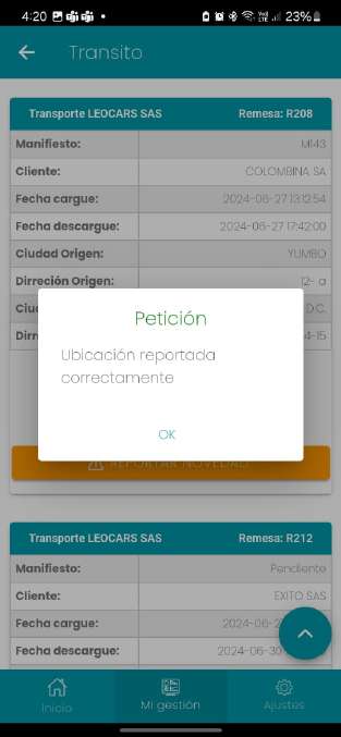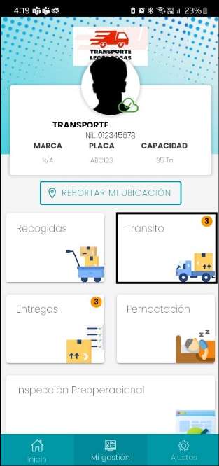 La aplicación direccionará al usuario a una vista donde podrá iniciar su reporte en la etapa de tránsito. En esta