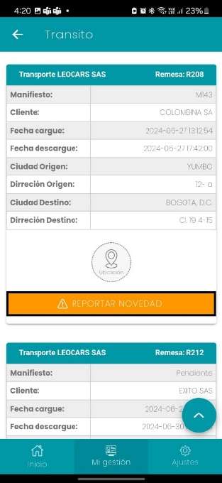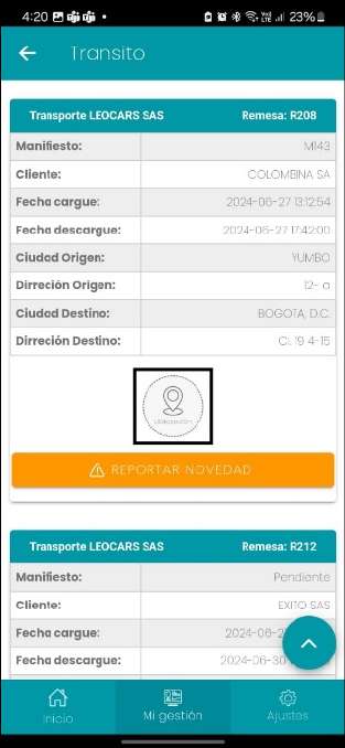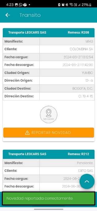 Si el usuario desea reportar una novedad en la etapa de tránsito, debe hacer clic en el botón “Reportar Novedad”.