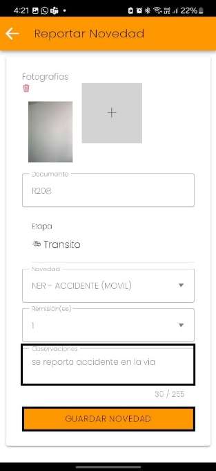 En el campo “Etapa”, que indica la etapa en la que se está reportando la novedad, en este caso, tránsito.