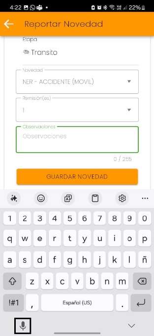 Si el usuario necesita usar el micrófono del dispositivo para diligenciar el campo de observación, debe identificar la opción “Micrófono” en el teclado del celular.
